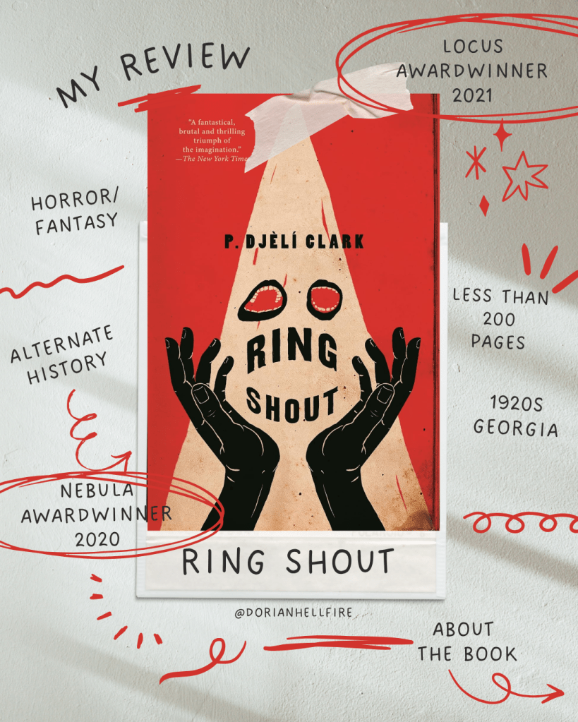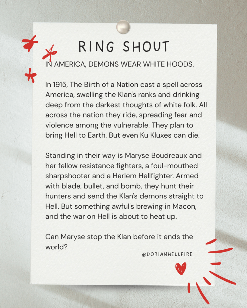 Ring Shout takes place around 1920, after slavery was over but blacks were still considered the lesser class compared to The Klan. Don’t let the description fool you. It’s a fantasy/ paranormal/ horror book with plenty of wtf gore and nightmare fuel in it that also hits home with how things ring true even today.