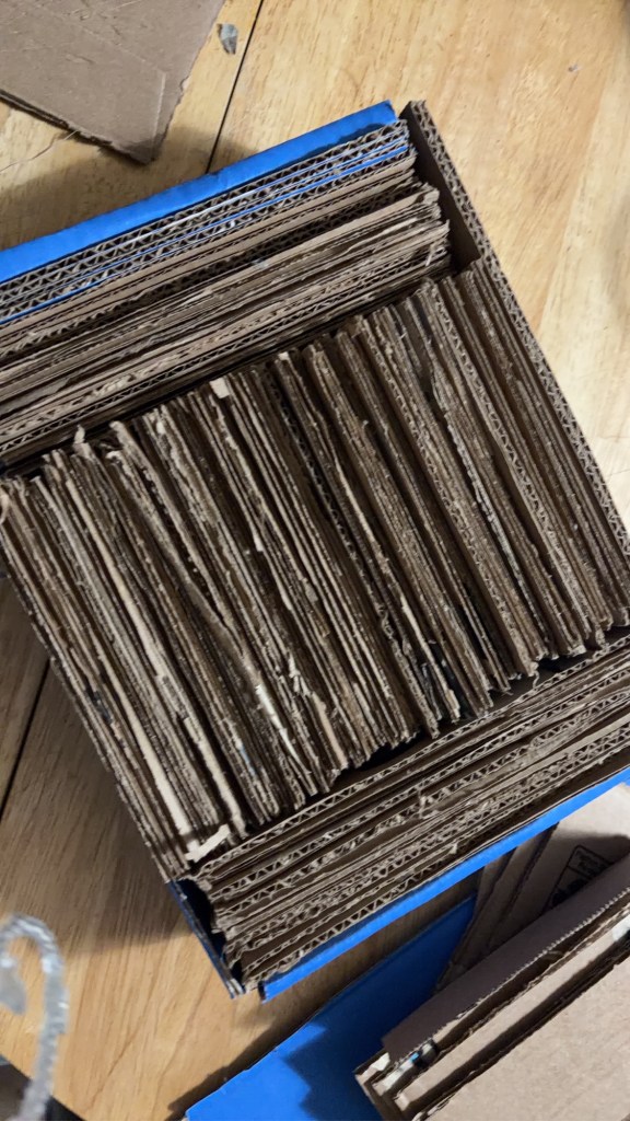 I cut the lid off and the fold that closes the box is the same width as the sides so that was my ruler. I didn’t concern over perfection because this is meant to be scratched on. You need as much extra cardboard as can fit in snuggly so this is one area I can’t tell. I so happened to have a couple extra Zon boxes and it worked out to about 3 book sized boxes and a medium square box for this with scraps and extra small pieces for the next one I make.